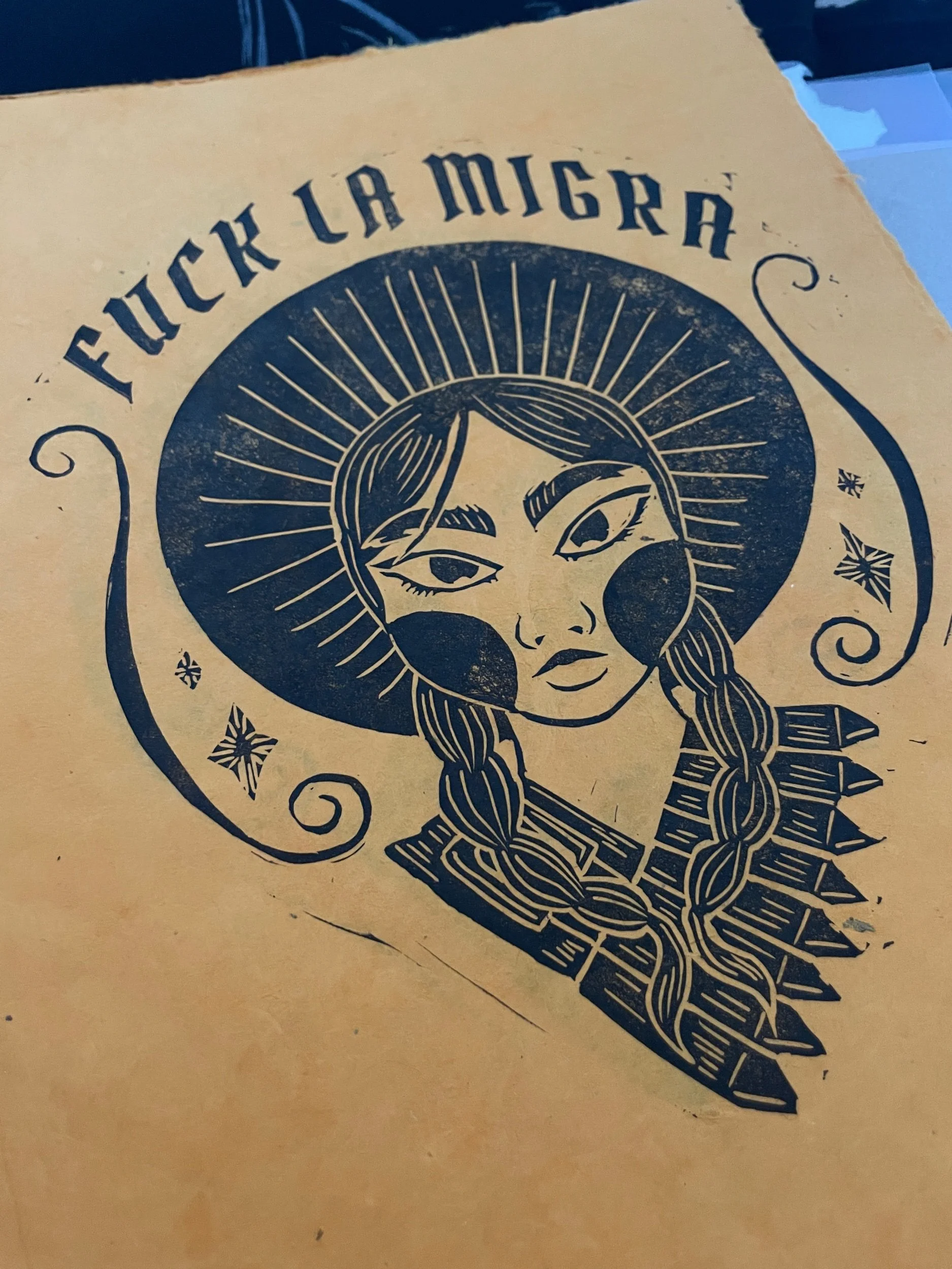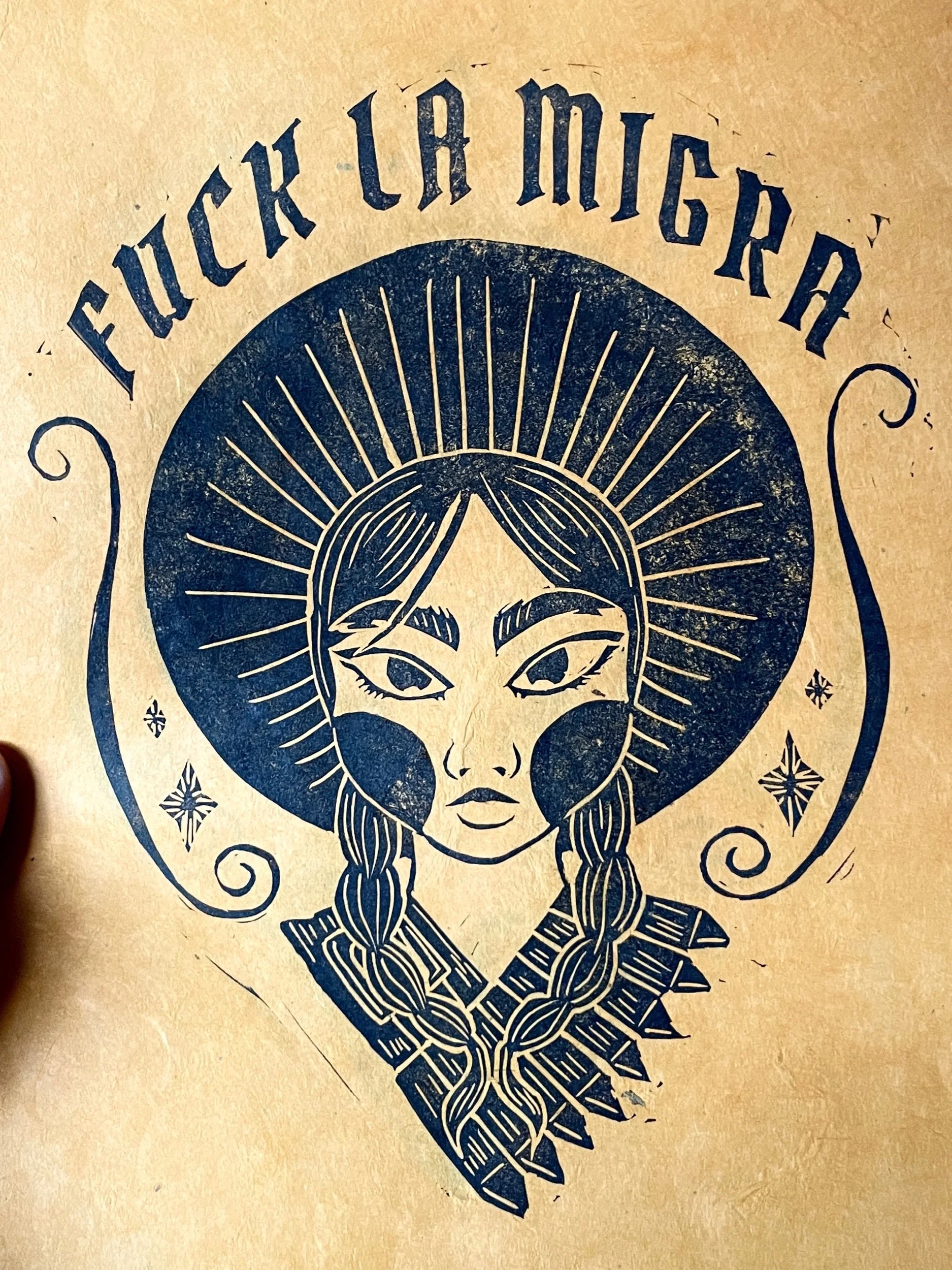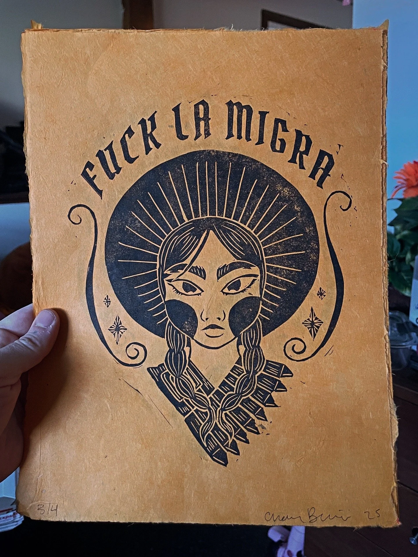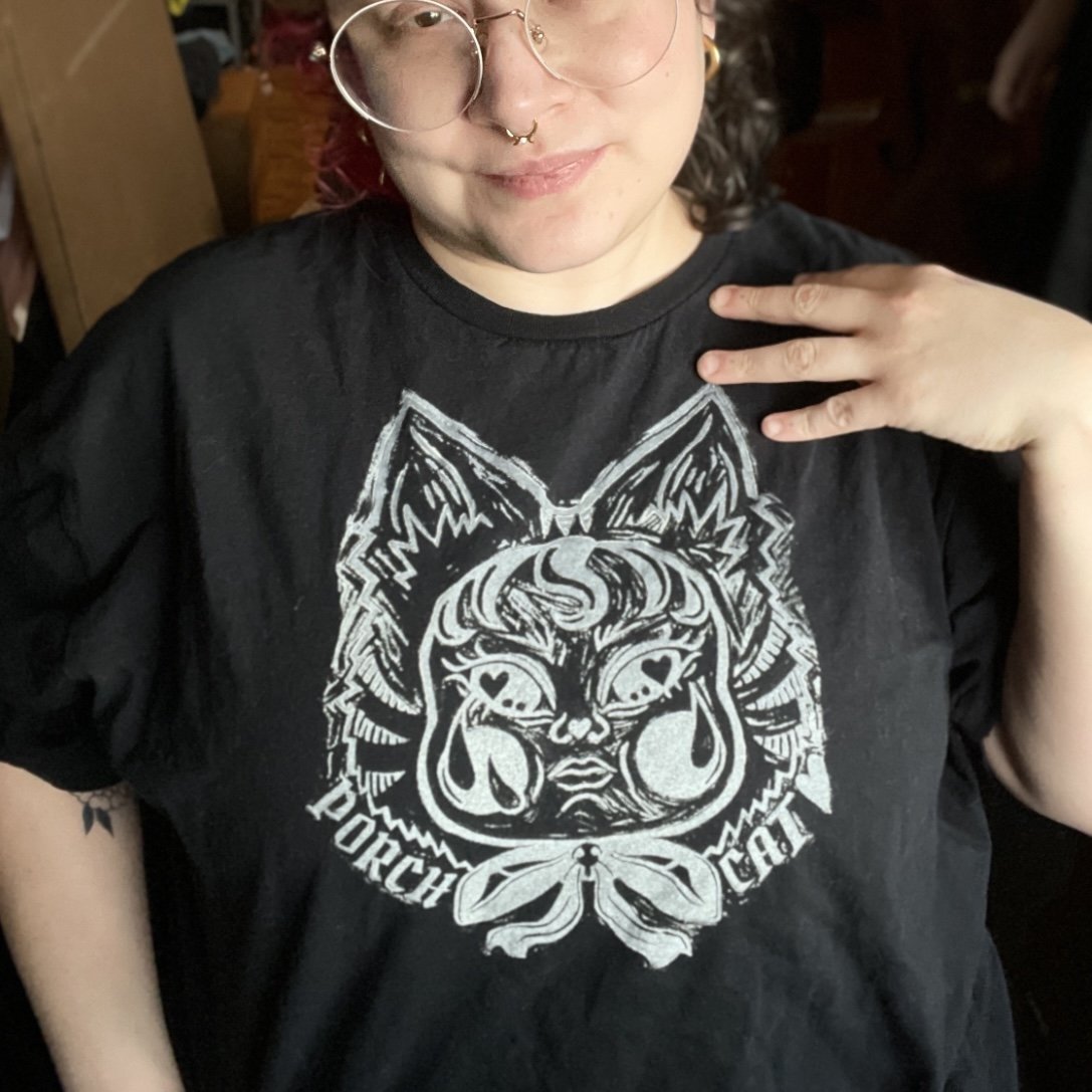 Tops are usually printed by hand onto Bella + Canvas or Gildan shirts. Some items may be other brands. All ink is either Speedball or Cranfield.